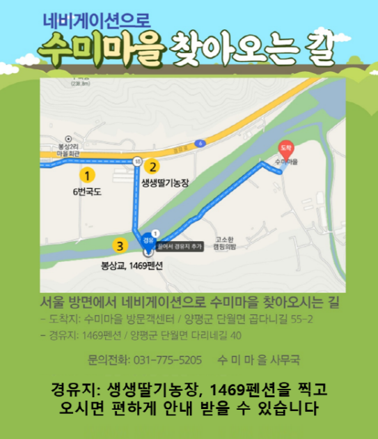 - 위치: 경기도 양평군 단월면 곱다니길 55-2 (수미마을) / 내비게이션에 '수미마을' 또는 해당 주소 검색